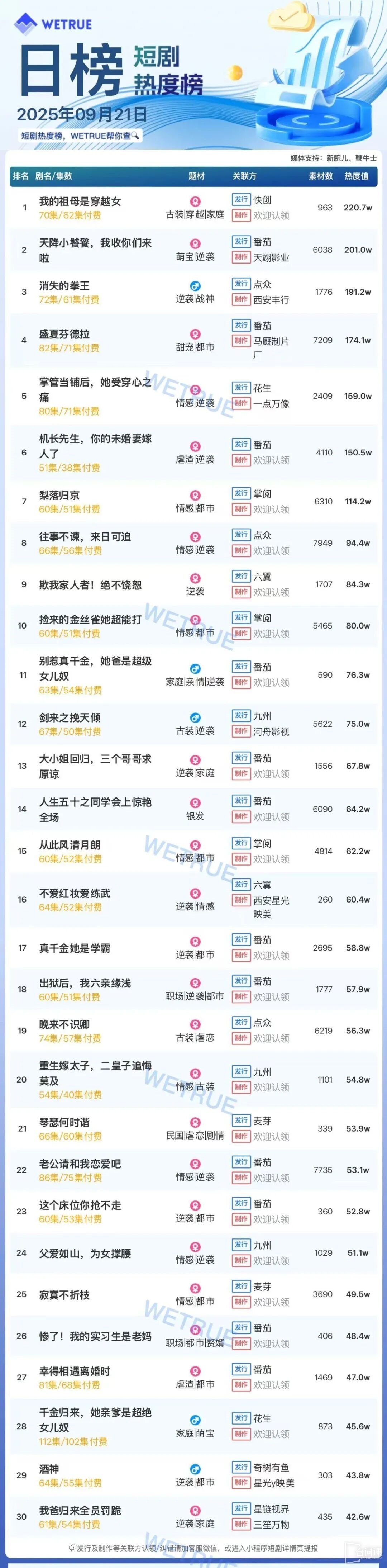 以上内容就是对9月21日短剧热度排行:快创《我的祖母是穿越女》登顶第一的最全解析了,如果觉得小编的这篇文章对大家有一些帮助的话,欢迎继续关注我们,之后小编会继续为大家带来最新最全的剧情解析和人物解读。
