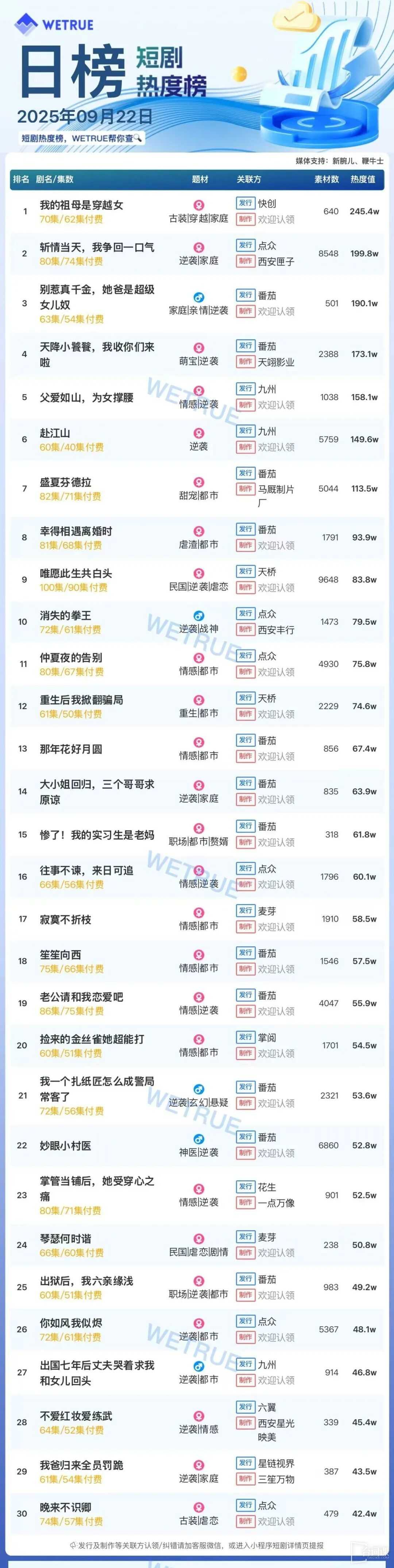 以上就是关于9月22日短剧热度排行:快创《我的祖母是穿越女》登顶第一的全部内容。如果您对这部影视剧感兴趣并想要了解更多信息,我们诚挚地邀请您继续关注台词课的最新动态。未来我们将为您提供更加详尽的剧情分析,丰富的角色介绍和更多背景故事等内容。