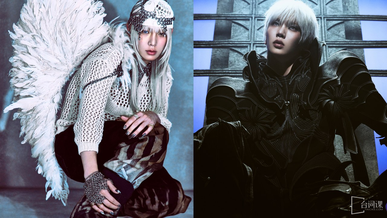 本次回归就连宣传照也不马虎,KEY展现了极具冲击力与未来感的前卫造型,他穿着一件镂空编织感的米白色针织上衣,融合温柔与强烈个性,背后一对如雕塑般立体的大型羽翼,以雪白羽毛堆叠出戏剧张力,营造出神秘又超现实的氛围,仿佛来自异世界的坠落天使。另外的宣传照还有宛如黑暗王者般的姿态坐镇于如同王座般的石质结构前,强势气场令人屏息。